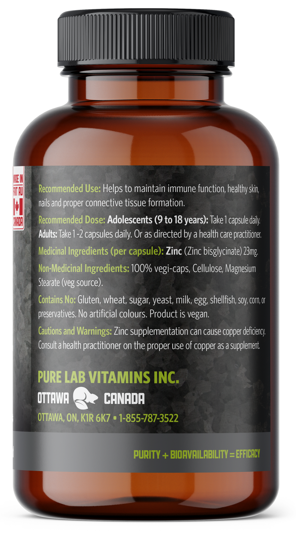 Our intent with Pure Lab’s Zinc Glycinate is to replenish the body’s zinc levels using only 23 milligrams of highly absorbable elemental zinc per capsule. Adults can take 2 capsules initially, then dose down to just one capsule ongoing to maintain zinc levels. Tweens and teens can take 1 capsule daily, or as directed by their primary health care practitioner.
